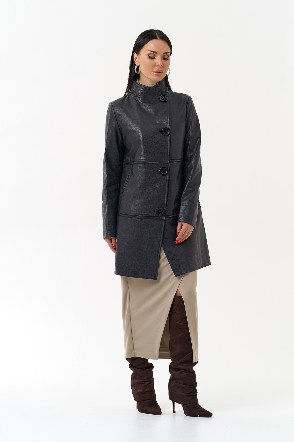 Плащ-трансформер из натуральной бараньей кожи в синем цвете в полуприлегающем фасоне. Подойдет для тех, кто любит перемены! Данное изделие можно носить в трех вариациях: укороченная кожаная куртка, классическая кожаная куртка и плащ. Акцентными деталями этой модели является ворот-стойка и большие пуговицы. Прочная и износостойкая кожа даст возможность сохранить ваше изделие на долгие годы, а количество вариаций образов с данной моделью позволит вам всегда оставаться в тренде.