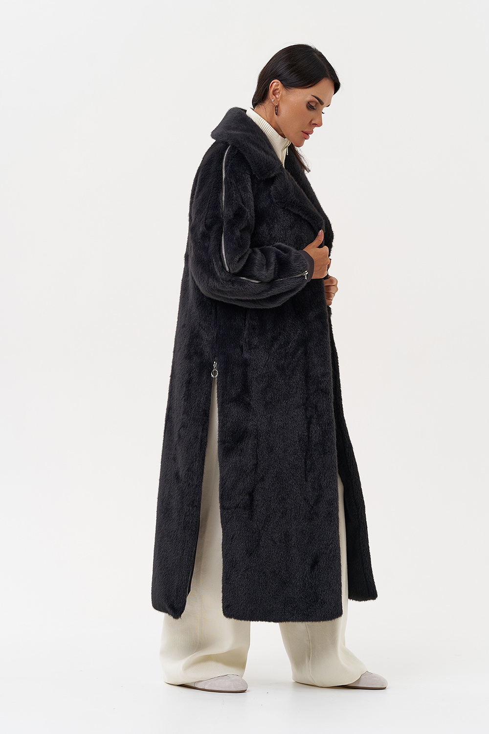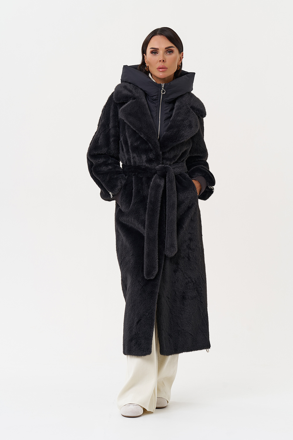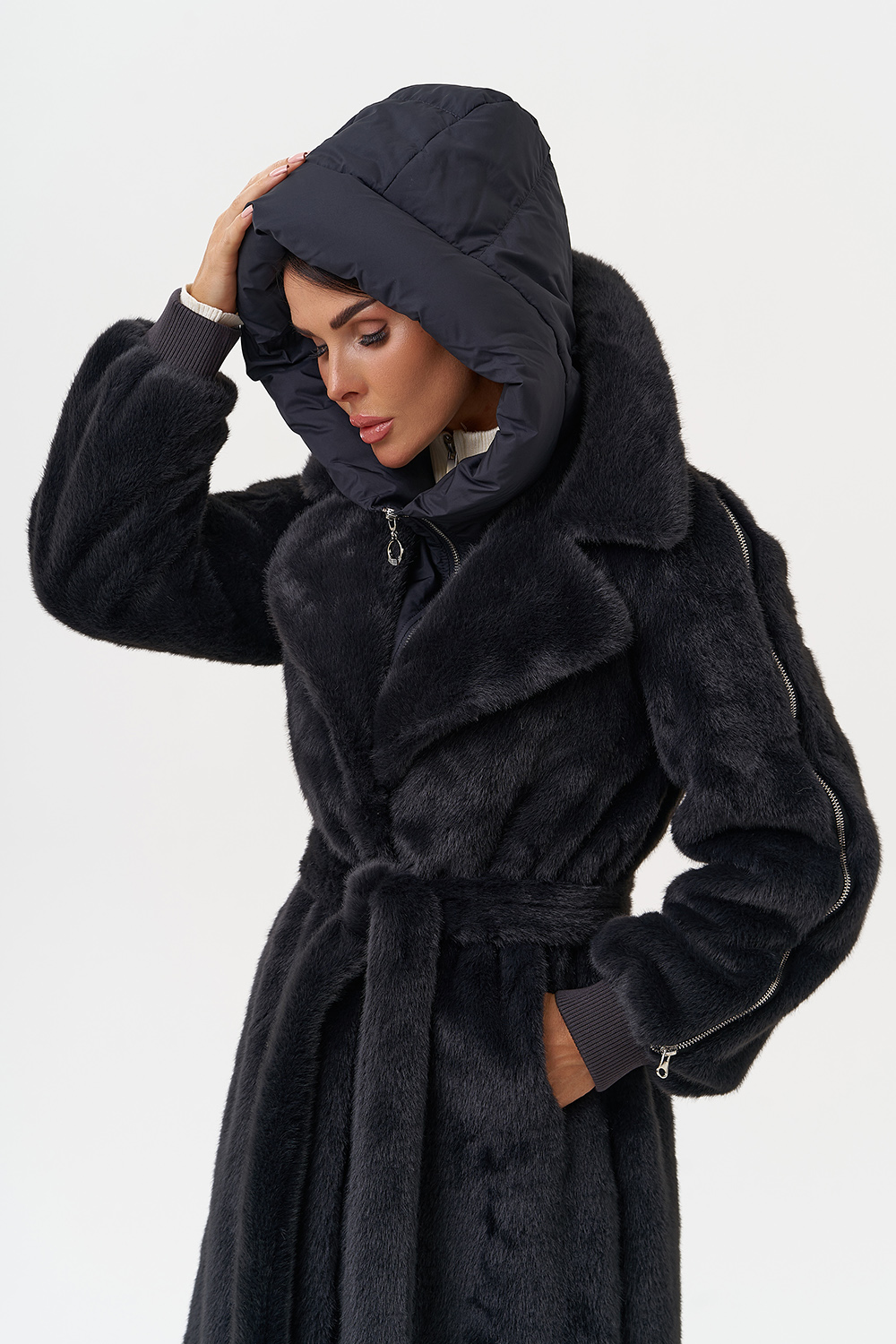 Фасон - прямой Длина изделия - 120 см Цвет - темно-серый (графит) Материал - экомех Состав полотна - полиэстер 100% Подкладка - полиэстер 100% Вид застежки - крючки, пояс Вид ворота - съёмный капюшон, английский воротник Фасон рукава - реглан, длинный |